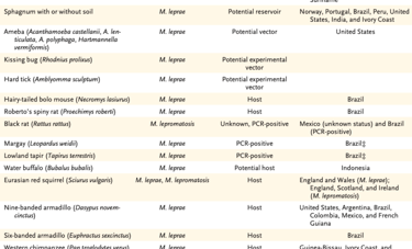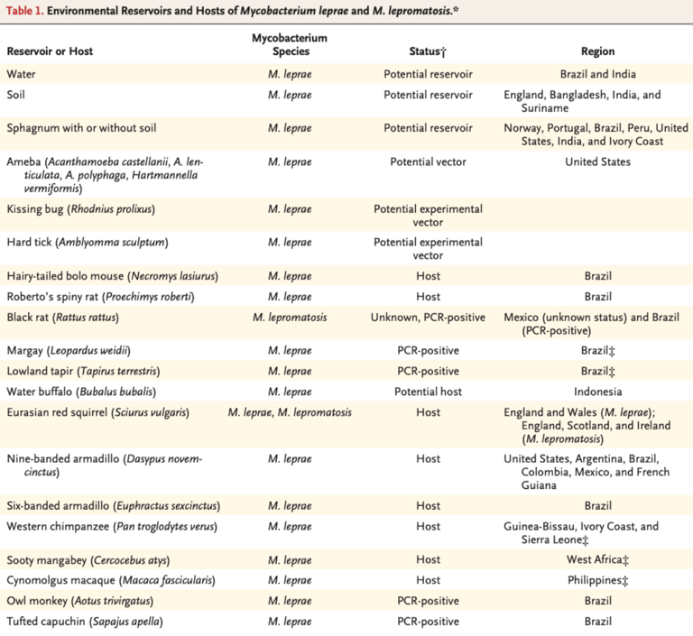Primary infections from the environment and potential insect and tick vectors should be considered in addition to zoonotic infection. Water and soil should be considered as potentially important environmental reservoirs. Mycobacterium leprae can survive in the laboratory for 7 to 90 days, but amebas can sustain bacteria for up 35 days, and cysts of amebas can keep M. leprae alive for up to 8 months. The environmental reservoir of M. lepromatosis, the second species that causes leprosy, remains to be elucidated. Dual infections in humans have been reported in Brazil, Mexico, and Southeast Asia.