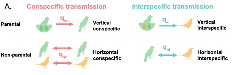 In host-symbiont systems, interspecific transmissions create opportunities for host switches, potentially leading to cophylogenetic incongruence. In contrast, conspecific transmissions often result in high host specificity and congruent cophylogenies. In most bird-feather mite systems, conspecific transmission is considered dominant, while interspecific transmission is supposedly rare. However, while mites typically maintain high host specificity, incongruent cophylogenies are common. To explain this conundrum, we quantify the magnitude of conspecific vs. interspecific transmission in the brood parasitic shiny cowbird (Molothrus bonariensis). M. bonariensis lacks parental care, allowing the assessment of the role of horizontal transmission alone in maintaining host specificity. We found that despite frequent interspecific interactions via foster parental care, mite species dispersing via conspecific horizontal contacts are three times more likely to colonize M. bonariensis than mites transmitted vertically via foster parents. The results highlight the previously underappreciated rate of transmission via horizontal contacts in maintaining host specificity on a microevolutionary scale. On a macroevolutionary scale, however, host switches were estimated to have occurred as frequently as codivergences. This suggests that macroevolutionary patterns resulting from rare events cannot be easily generalized from short-term evolutionary trends.
