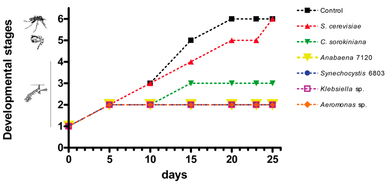 Culex pipiens development is greatly influenced by native bacteria and exogenous yeast.