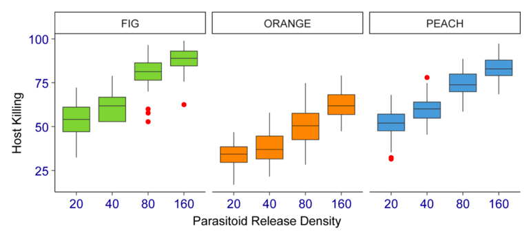 Effects of releasing two Diachasmimorpha longicaudata population lines for the control of Ceratitis capitata infesting three key host fruit species.