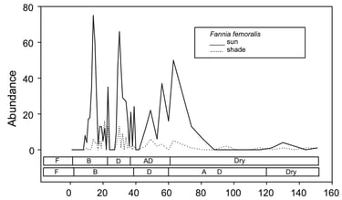 Besides the dominant necrophagous dipteran of the families Sarcophagidae and Calliphoridae usually used for post-mortem interval (PMI) estimations, species of other families such as Fanniidae have frequently been reported in forensic studies. Though less abundant, these species are prevalent in decomposing carcasses with most reports being anecdotal. In this study we identified adults of the fly family Fanniidae associated to pig carcasses located under different local environmental conditions (sun and shade) in a semiarid area at Mendoza, Argentina during the winter season. We examined the potential of species of this family as indicators of PMI by measuring abundance, time of occurrence and residency time at the carcasses. We identified six species of Fanniidae: Euryomma peregrinum Meigen, Fannia albitarsis Stein, Fannia femoralis Stein, Fannia fusconotata Rondani, Fannia heydenii Wiedemann and Fannia sanihue Domı ́nguez and Aballay. Overall, fly abundance was higher at the sunlit than at the shaded carcass. The most abundant species at the sun was F. fusconotata while at the shaded carcass F. femoralis was the most abundant species. Based on their residency time, however, species with higher potential as PMI indicators seem to be F. heydenii and F. sanihue as their residency time at the carcass was restricted to a short period of the decomposition process. Other species were present throughout most of the decomposition process or in such a low abundance (E. peregrinum) that they were not useful as indicators. These preliminary results indicate that adults of some species of Fanniidae could act as a good complementary indicator species during the winter season. In particular, F. heydenii and F. sanihue should be the focus of further studies which should also expand to other seasons.