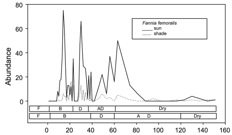 Besides the dominant necrophagous dipteran of the families Sarcophagidae and Calliphoridae usually used for post-mortem interval (PMI) estimations, species of other families such as Fanniidae have frequently been reported in forensic studies. Though less abundant, these species are prevalent in decomposing carcasses with most reports being anecdotal. In this study we identified adults of the fly family Fanniidae associated to pig carcasses located under different local environmental conditions (sun and shade) in a semiarid area at Mendoza, Argentina during the winter season. We examined the potential of species of this family as indicators of PMI by measuring abundance, time of occurrence and residency time at the carcasses. We identified six species of Fanniidae: Euryomma peregrinum Meigen, Fannia albitarsis Stein, Fannia femoralis Stein, Fannia fusconotata Rondani, Fannia heydenii Wiedemann and Fannia sanihue Domı ́nguez and Aballay. Overall, fly abundance was higher at the sunlit than at the shaded carcass. The most abundant species at the sun was F. fusconotata while at the shaded carcass F. femoralis was the most abundant species. Based on their residency time, however, species with higher potential as PMI indicators seem to be F. heydenii and F. sanihue as their residency time at the carcass was restricted to a short period of the decomposition process. Other species were present throughout most of the decomposition process or in such a low abundance (E. peregrinum) that they were not useful as indicators. These preliminary results indicate that adults of some species of Fanniidae could act as a good complementary indicator species during the winter season. In particular, F. heydenii and F. sanihue should be the focus of further studies which should also expand to other seasons.