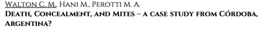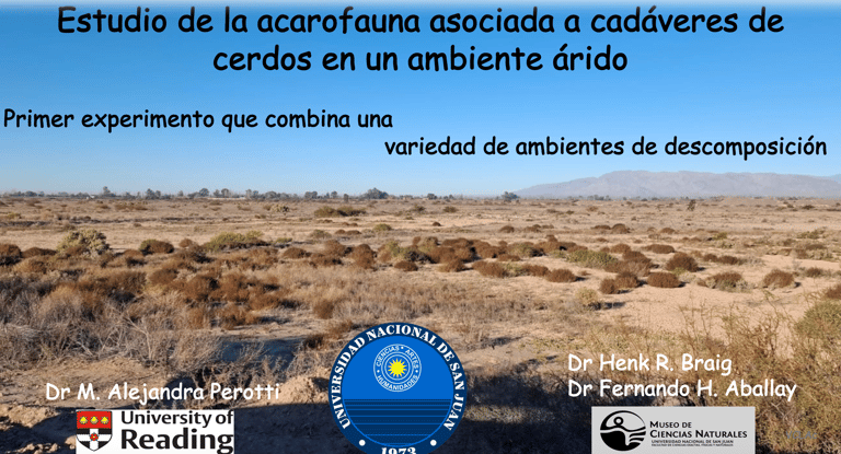 Se presentarán los detalles de un diseño experimental que estudia ácaros y parásitos asociados a carcasas de cerdos contemplando en simultaneo cadáveres i) en superficie, ii) colgados, iii) enterramientos en fosas simples, y iv) en fosas comunes (carcasas múltiples). El ambiente natural del experimento es zona árida de Argentina, en la provincia de San Juan.